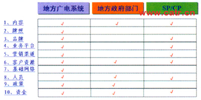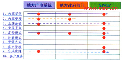 在投資與收益方面,雙方共同出資,成立公司,調(diào)動雙方相關(guān)的優(yōu)勢資源。并且協(xié)調(diào)了與SP/CP、政府、行業(yè)部門等多方面原本復(fù)雜的關(guān)系。能夠增加的收入是點播和直播節(jié)目收費(fèi)。收費(fèi)模式方面增加電視包月費(fèi)、頻道組合費(fèi)。合作分成通過股份公司分紅。