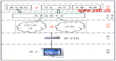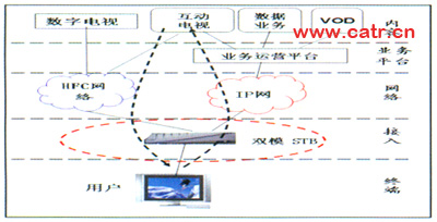 這種模式的合作點主要在接入層面,以提供雙模機(jī)頂盒為主要方法。固網(wǎng)公司和廣電發(fā)揮各自資源優(yōu)勢進(jìn)行合作。廣電節(jié)目傳送由廣電負(fù)責(zé),同網(wǎng)提供寬帶增值服務(wù),兩者分業(yè)經(jīng)營,地位平等。