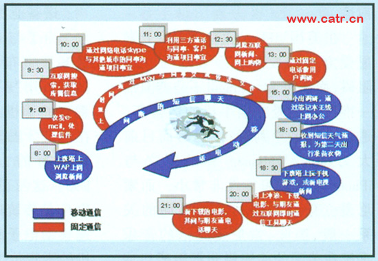 隨著軟交換、IMS等技術(shù)的逐步成熟、寬帶IP接入的發(fā)展、用戶對(duì)業(yè)務(wù)的需求、運(yùn)營(yíng)商向全業(yè)務(wù)的轉(zhuǎn)型等多種因素影響,固定移動(dòng)融合(FMC)又重新成為電信業(yè)的熱點(diǎn)問題。本文從分析固定移動(dòng)融合(FMC)的驅(qū)動(dòng)力、特點(diǎn)及影響因素入手,提出了運(yùn)營(yíng)商在FMC趨勢(shì)下的發(fā)展策略。圖1 一個(gè)白領(lǐng)一天的電信服務(wù)需求