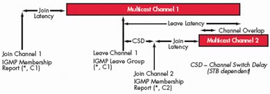 TV節(jié)目通常采用組播方式進(jìn)行傳送。組播是一種允許一個(gè)或多個(gè)發(fā)送者(組播源)一次同時(shí)發(fā)送單一的數(shù)據(jù)包到多個(gè)接收者的網(wǎng)絡(luò)技術(shù)。組播源把數(shù)據(jù)包發(fā)送到特定組播組,而只有屬于該組播組的地址才能接收到數(shù)據(jù)包。在IPTV里,組播源往往僅有一個(gè),即使用戶數(shù)量成倍增長(zhǎng),主干帶寬也不需隨之增加,因?yàn)闊o論有多少個(gè)目標(biāo)地址,在整個(gè)網(wǎng)絡(luò)的任何一條主干鏈路上只傳送單一視頻流,即所謂“一次發(fā)送,組內(nèi)廣播”。組播提高了數(shù)據(jù)傳送效率,減少了主干網(wǎng)出現(xiàn)擁塞的可能性。對(duì)于TV系統(tǒng)而言,其所能夠支持的用戶數(shù)目?jī)H僅受到接入網(wǎng)絡(luò)能力的限制,與前端推送系統(tǒng)的推送能力無關(guān)。因此,TV業(yè)務(wù)性能的主要測(cè)試指標(biāo)包括所推送的最大頻道數(shù)目、頻道平均帶寬、平均頻道切換時(shí)間、I幀加入延時(shí)、平均頻道離開延時(shí)、平均頻道加入延時(shí)、頻道重疊時(shí)間和頻道間隔時(shí)間。