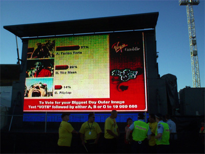 比如,某些公司可能會使用上面所述的調(diào)節(jié)型文本信息收發(fā)方式來顯示滾動的帶狀區(qū)內(nèi)容,但也會在文本顯示的過程中覆蓋某張由手機用戶拍攝的圖象。這張圖片一般可能是該用戶的貓或狗,然后加上一些有趣的元素。在戶外活動中,我們可以用拍到的圖象來加強文本信息。比如,活動現(xiàn)場可以就屏幕上的一張照片提問“他夠不夠火辣?”。這樣的問答結果隨后就可以被實時廣播到屏幕上。