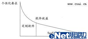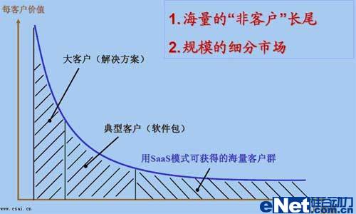 SaaS模式就是不論是什么樣的客戶都向其提供服務(wù),不論服務(wù)的時(shí)間長短,不論身處何地。傳統(tǒng)軟件是很難適應(yīng)普通客戶的,普通客戶付不出更多的投資,也不想軟件、硬件、服務(wù)都全面去投資,這樣就只有放棄使用軟件了。自然,軟件市場(chǎng)就少了一大群消費(fèi)者。而SaaS模式將不細(xì)分客戶類型,讓人人都可使用軟件,讓個(gè)個(gè)都消費(fèi)得起軟件?上攵,這是一個(gè)怎么龐大的市場(chǎng)。如下圖所示: