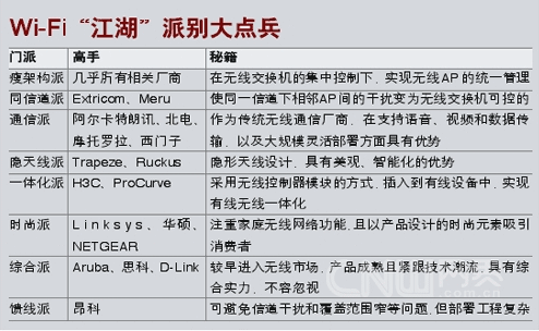 少林、武當(dāng)、華山、峨嵋、丐幫……眾多門派共同支撐起了武俠小說當(dāng)中的“江湖”。而在無線網(wǎng)絡(luò)的“江湖”上,其實也存在著很多門派:比如瘦架構(gòu)派、同信道派、一體化派、通信派、隱天線派、時尚派等,各家廠商都有自己的看家本事,在極大豐富了無線產(chǎn)品,更好滿足了用戶需求的同時,也促進(jìn)了無線技術(shù)在多個層面上的深入發(fā)展。網(wǎng)界網(wǎng)