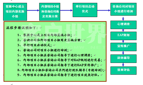 中心采用“內(nèi)部為主,內(nèi)外結(jié)合”的方式,在中心選取符合EAP項(xiàng)目實(shí)施基本知識(shí)技能要求的人員組建內(nèi)部EAP去專業(yè)化應(yīng)用團(tuán)隊(duì),由咨詢公司負(fù)責(zé)培養(yǎng)客服中心內(nèi)部EAP團(tuán)隊(duì)人員。內(nèi)部項(xiàng)目小組在咨詢公司指導(dǎo)下開(kāi)展心理調(diào)查、規(guī)劃完善、宣傳推廣、團(tuán)隊(duì)輔導(dǎo)、效果評(píng)估等一系列活動(dòng)。