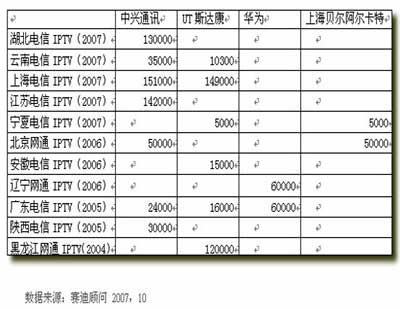 在IPTV設備供應商中,各家廠商各有千秋,其中在國內市場占有率最好的是中興通訊,其次是UT斯達康、華為、上海貝爾阿爾卡特。中興通訊跟華為均能提供端到端的解決方案,從頭端到客戶端,從業(yè)務層到傳輸層,提供完整的設備,可以使用統(tǒng)一的平臺對整個系統(tǒng)進行管理,并且在保證統(tǒng)一的同還提供了較好的開放性,支持多家內容提供商及STB的接入。