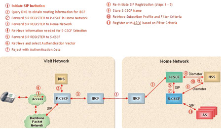 隨著3G時(shí)代的到來,用戶對移動(dòng)通信有了更高的期望,用戶不僅要求有穩(wěn)定的語音通信,而且還要求能夠以數(shù)據(jù)和多媒體等多種方式進(jìn)行通信。針對這些需求,3GPP在R5版本中提出了IMS標(biāo)準(zhǔn)。而隨著網(wǎng)絡(luò)技術(shù)的發(fā)展,各種標(biāo)準(zhǔn)組織也開始了IMS版本演進(jìn)方面的研究。圖1 IMS注冊流程