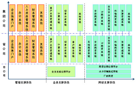 從系統(tǒng)的部署來看,主要集中在集團與省公司,其中,集團公司系統(tǒng)主要具備面向全公司的企業(yè)管理、經(jīng)營分析等功能;省公司從以職能管理為主逐步轉(zhuǎn)變?yōu)橐陨a(chǎn)管理為主,具有了越來越多的生產(chǎn)職能,在運營支撐系統(tǒng)建設(shè)中的作用更加突出;市公司的生產(chǎn)管理職能有所削弱,將主要負責市場的具體營銷、客戶支撐以及設(shè)備的現(xiàn)場維護等工作,F(xiàn)有系統(tǒng)主要存在以下幾個問題: