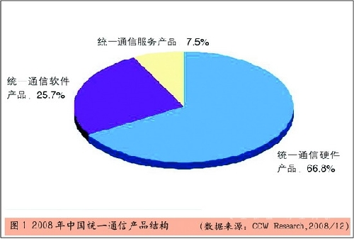 從產(chǎn)品結構角度分析,雖然受硬件設備價格因素的影響,統(tǒng)一通信設備市場仍然是通信市場中最大份額的一部分,市場份額占到66.8%。而且隨著企業(yè)用戶對于統(tǒng)一通信理解能力的加深,統(tǒng)一通信軟件產(chǎn)品與統(tǒng)一通信服務越來越受到更多企業(yè)的認同。與2007年相比,統(tǒng)一通信軟件和服務產(chǎn)品市場份額有一定比例的增加。2008年,統(tǒng)一通信軟件產(chǎn)品達到市場份額的25.7%,特別是統(tǒng)一通信服務產(chǎn)品,增長迅速,市場份額超過7.5%。