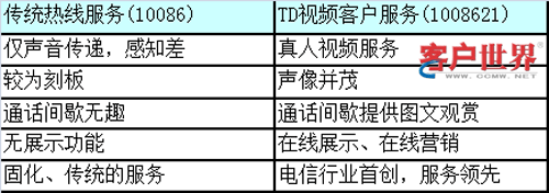 TD視頻客服與傳統(tǒng)語音熱線服務(wù)相比,最大區(qū)別在于可通過“面對面”方式向客戶提供相關(guān)服務(wù),具備“服務(wù)”和“體驗”兩大特點。視頻客服在服務(wù)內(nèi)涵、內(nèi)容等方面有較大的深化與突破空間,是多媒體呼叫中心服務(wù)手段的一種有效形式之一。