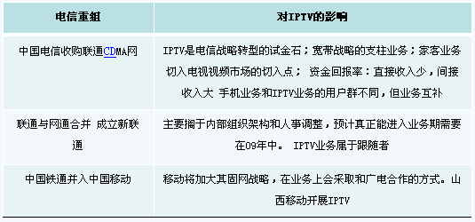 三網(wǎng)融合從十五大起就已經(jīng)被列入了發(fā)展目標(biāo),無論是廣電和電信,都在期望自己成為未來三網(wǎng)融合的主導(dǎo)者。廣電在08年和科技部合作推出了NGB下一代廣播網(wǎng)的建設(shè)。而《電信法》則是電信的政策機(jī)遇。根據(jù)電信法的規(guī)定,會(huì)成立三網(wǎng)融合的監(jiān)管機(jī)構(gòu)。電信要想掌握主動(dòng)權(quán),必須在三網(wǎng)融合的相關(guān)業(yè)務(wù)中充分證明其實(shí)力,IPTV作為三網(wǎng)融合的代表業(yè)務(wù),其發(fā)展?fàn)顩r,將關(guān)系到電信在未來三網(wǎng)融合中的主導(dǎo)權(quán)。