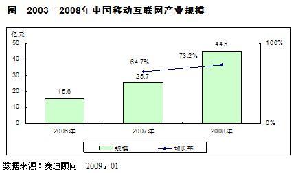 2008年中國移動互聯網產業(yè)以73.2%的高速增長,實現了44.5億元的收入規(guī)模。