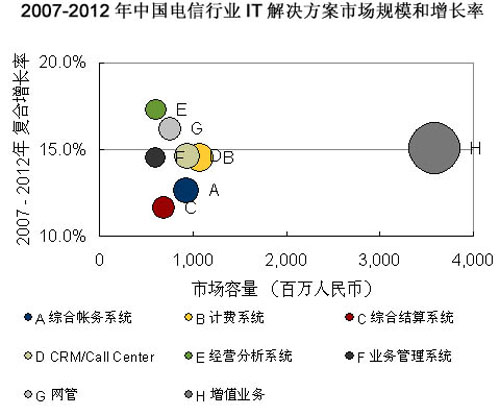 巨大的電信市場蛋糕給產(chǎn)業(yè)鏈的各級廠商都帶來良好的發(fā)展機(jī)遇,而其運(yùn)營支撐系統(tǒng)市場無疑將是增長最快的一部分。據(jù)市場調(diào)查機(jī)構(gòu)IDC預(yù)計(jì),2007年-2012年電信行業(yè)將注重運(yùn)營支撐系統(tǒng)的全業(yè)務(wù)運(yùn)營整合和支持前端業(yè)務(wù),因此3G增值業(yè)務(wù)、經(jīng)營分析系統(tǒng)、客戶關(guān)系管理系統(tǒng)、IT服務(wù)管理系統(tǒng)等建設(shè)將實(shí)現(xiàn)快速增長。運(yùn)營商的已有項(xiàng)目仍然會持續(xù)升級維護(hù),以及配合全業(yè)務(wù)運(yùn)營作出功能上的提升。IDC預(yù)計(jì),2012年電信行業(yè)IT解決方案整體市場規(guī)模將達(dá)到193.5億元人民幣。