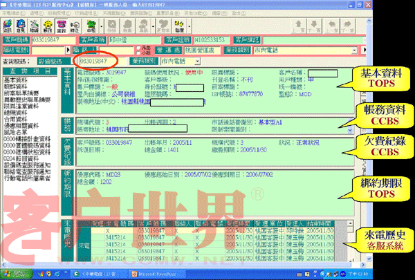 我們推動「CPEP客服流程提升計劃」的重點是在IVR流程中就請客戶自行輸入其欲查詢或辦理的電話號碼,同時客服系統(tǒng)便先透過EAI到后端信息系統(tǒng),查詢出該號碼的核心數據(含基本、帳務、欠費記錄、來電歷史等),當客服人員應答時客服系統(tǒng)便立即將這些核心數據顯示在屏幕上(如圖一),客服人員便可立即掌握此客戶之相關資料,CPEP如此改善后平均的服務效率提升了11%。