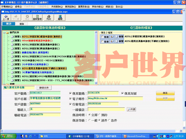 EFE第一步先將所有的窗口、文件與數據轉為電子化的檔案,當需要傳送書面文件給客戶時,客服人員可立即在在線點選以傳真或電子郵件將文件傳給客戶(如圖二),傳送成功后并立即以SMS通知客戶。當客戶反饋數據回來時,EFE會自動接收并存盤,接收成功后EFE則會立即發(fā)送SMS訊息給客戶安心,而且所有送出與接收文件都有完整記錄可共管理、追蹤與處理。