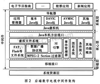為了支持交互電視的發(fā)展,國際上許多組織制訂了相關(guān)的中間件標(biāo)準(zhǔn),比如歐洲D(zhuǎn)VB提出的MHP,美國針對(duì)有線電視系統(tǒng)由Cablelabs提出的OCAP,美國ATSC提出的DASE等,其中MHP標(biāo)準(zhǔn)應(yīng)用最為廣泛。圖2提出的中間件架構(gòu)符合國家數(shù)字電視中間件標(biāo)準(zhǔn)(草案),以JavaTM語言為基礎(chǔ),在MHP基礎(chǔ)上去除了MHP包中的冗余部分。