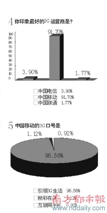 1、中國(guó)移動(dòng)的3G口號(hào)是?超過(guò)98%的被訪者選擇了“引領(lǐng)3G生活”這一正確選項(xiàng)。2、你是否考慮升級(jí)到3G手機(jī)?選擇“會(huì)升級(jí)”的接近80%。如果考慮升級(jí)到3G手機(jī),你最想使用哪家運(yùn)營(yíng)商的服務(wù)?中國(guó)移動(dòng)奪得了超過(guò)九成的選票。但當(dāng)最后問(wèn)到,“你印象中,中國(guó)移動(dòng)的3G標(biāo)準(zhǔn)是?”時(shí),正確選項(xiàng)T D -SCD M A的得票率竟只有三成左右。