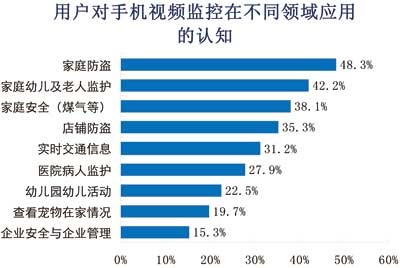 手機(jī)監(jiān)控業(yè)務(wù)是把無(wú)線監(jiān)控設(shè)備的視頻信號(hào)通過(guò)公眾無(wú)線移動(dòng)通信網(wǎng)絡(luò)傳輸,實(shí)現(xiàn)實(shí)時(shí)在線查看現(xiàn)場(chǎng)情況,不受時(shí)間和地域限制的3G新業(yè)務(wù)。用戶可以隨時(shí)隨地主動(dòng)去查看監(jiān)控現(xiàn)場(chǎng),或者當(dāng)有報(bào)警信號(hào)產(chǎn)生的時(shí)候,也可以馬上得到通知,并通過(guò)查看現(xiàn)場(chǎng)情況對(duì)報(bào)警進(jìn)行確認(rèn)。圖1用戶對(duì)手機(jī)視頻監(jiān)控應(yīng)用于不同領(lǐng)域的認(rèn)知