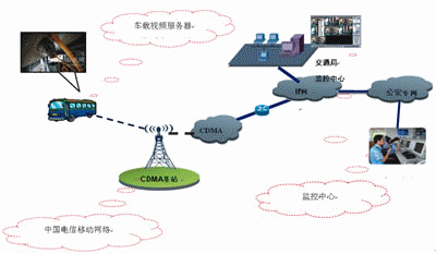 從運(yùn)營(yíng)商的角度上,視頻監(jiān)控已經(jīng)發(fā)展成為中國(guó)電信重要的增值業(yè)務(wù),為中國(guó)電信向綜合信息提供商轉(zhuǎn)型奠定了堅(jiān)實(shí)的基礎(chǔ)。同時(shí),在國(guó)內(nèi)移動(dòng)增值業(yè)務(wù)多元發(fā)展的大環(huán)境下,監(jiān)控本身也向著移動(dòng)化、智能化方向發(fā)展。車載監(jiān)控產(chǎn)品就是移動(dòng)監(jiān)控業(yè)務(wù)的車載應(yīng)用。中國(guó)電信的車載監(jiān)控產(chǎn)品依托于“全球眼”平臺(tái)及EV-DO(cdma20001x)無(wú)線網(wǎng)絡(luò),通過車載移動(dòng)采集視頻等信息,實(shí)現(xiàn)遠(yuǎn)程視頻瀏覽、遠(yuǎn)程控制等功能,滿足客戶遠(yuǎn)程視頻查看、遠(yuǎn)程應(yīng)急指揮的需求,向“全球眼”應(yīng)用客戶提供隨時(shí)隨地的無(wú)線視頻監(jiān)控服務(wù)。圖1 車載監(jiān)控系統(tǒng)工作原理示意圖
