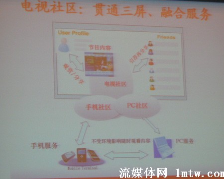 百視通在數(shù)月前便發(fā)布了三屏融合戰(zhàn)略,據(jù)李川介紹,百視通是從節(jié)目分享開始著手的。比如發(fā)一個(gè)片花到手機(jī)上,用戶喜歡的話可以定制,IPTV上設(shè)一個(gè)入口,兩相對接,用戶點(diǎn)一兩個(gè)鍵就可以很方便的看到他需要的視頻,從而解決了不斷翻頁造成用戶流失的問題。而在電腦上,也可以實(shí)現(xiàn)這樣的定制,甚至是異地傳送。亦即即使出差在外地,也可以很簡單的通過互聯(lián)網(wǎng)定制IPTV節(jié)目送給家人、朋友。