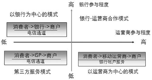 系統(tǒng),通過定制終端,電信運(yùn)營商可以將各種先進(jìn)的移動(dòng)應(yīng)用提供給用戶,使用戶獲得良好的移動(dòng)化生活體驗(yàn)。因此,電信運(yùn)營商在移動(dòng)支付方面具有較好的用戶資源和營銷渠道?梢姡娦胚\(yùn)營商和銀行的協(xié)作程度在很大程度上決定了移動(dòng)支付商業(yè)模式的績效水平。