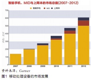 隨著3G對移動(dòng)信息處理的促進(jìn),未來幾年,MS市場尤其是智能化接入設(shè)備市場的增長將非常迅速,根據(jù)有關(guān)機(jī)構(gòu)的分析,智能手機(jī)、MID、上網(wǎng)本等移動(dòng)上網(wǎng)裝置從2007年至2012年的年復(fù)合成長率將達(dá)到36%,而到2012年為止,市場上將會有超過6億部的移動(dòng)終端,如圖1所示,藉由3G移動(dòng)通信和WLAN的帶動(dòng),移動(dòng)接入設(shè)備將實(shí)現(xiàn)從人手一部向人手兩部甚至多部的方向邁進(jìn)。