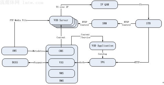 QAM則是網(wǎng)絡設備產(chǎn)品,因此交互平臺架構的核心組成包括:視頻服務系統(tǒng)VOD Server、業(yè)務管理系統(tǒng)BMS、會話和資源管理系統(tǒng)SRM、應用管理系統(tǒng)VOD