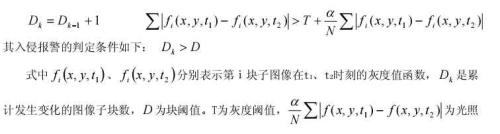 在幀間差分基礎(chǔ)上,引入圖像塊概念,將圖像分成M個n×n的子塊,判斷每一子塊圖像是否發(fā)生變化,統(tǒng)計發(fā)生變化的子塊數(shù)目,判斷式為: