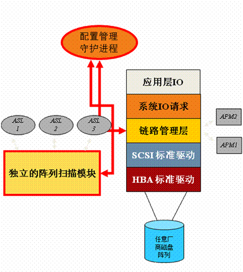 該技術(shù)的特點(diǎn)是通過(guò)主機(jī)層軟件方式建立存儲(chǔ)管理虛擬層,利用專業(yè)的第三方鏈路管理軟件解決磁盤陣列和主機(jī)的連通兼容性。其運(yùn)行依靠工作在存儲(chǔ)網(wǎng)絡(luò)鏈路管理層的軟件程序來(lái)完成,其體系架構(gòu)圖如下: