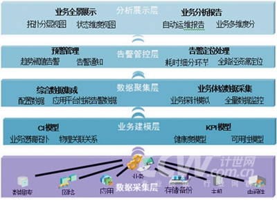 業(yè)務(wù)建模層: 是整個監(jiān)控系統(tǒng)的核心,是將業(yè)務(wù)進行有形化管理、量化衡量的高效手段。該業(yè)務(wù)建模層中涵蓋了幾乎所有的BOSS管理資源要素,包括業(yè)務(wù)、應(yīng)用、服務(wù)及其他平臺類資源,這些信息都建立并實時更新于企業(yè)集中建設(shè)的符合ITIL標準的CMDB(配置資源數(shù)據(jù)庫,其中每一子項便是一個CI配置資源項)中;贑MDB中動態(tài)調(diào)整的實時CI項和相互關(guān)系,關(guān)聯(lián)上能夠反映業(yè)務(wù)當前狀況的KPI指標,以結(jié)構(gòu)化的模型框架為指導(dǎo),建立完整的業(yè)務(wù)CI/KPI指標體系,繪制出以業(yè)務(wù)為中心的BOSS系統(tǒng)視圖,全面展現(xiàn)其健康度和可用性。