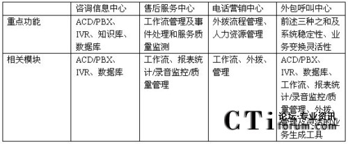 下面我們以圖表的形式給出上述四種呼叫中心的重點(diǎn)功能需求: