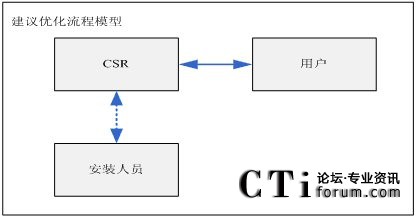 對于客服中心來講,當受理了用戶的需求時,CSR與用戶便成了服務流程中的關鍵角色,安裝人員只是CSR的一個協(xié)作角色(內(nèi)部流程下游角色)。如果在為用戶提供服務過程中,將安裝人員“引入”流程中,無疑將影響流程的執(zhí)行效果。另外,讓用戶代替CSR去聯(lián)系“安裝人員”這更加影響用戶的感受。