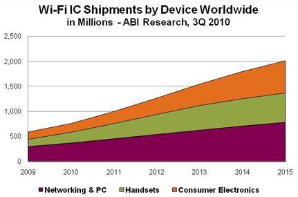 Wi-Fi技術(shù)現(xiàn)已被用于幾乎所有筆記本和上網(wǎng)本、智能電話和游戲設(shè)備。電話、音頻播放器、打印機(jī)、機(jī)頂盒以及其他消費(fèi)類電子設(shè)備對Wi-Fi技術(shù)的采用率也在不斷增加,來自Wi-Fi聯(lián)盟和多家調(diào)研機(jī)構(gòu)的數(shù)據(jù)印證了這種市場增長趨勢。2009年,僅在中國銷售的具備Wi-Fi功能的筆記本電腦就達(dá)到800萬臺,全球Wi-Fi設(shè)備認(rèn)證數(shù)量則增加了約50%,消費(fèi)類電子設(shè)備和電話數(shù)量增加了100%以上。截止到2010年7月,消費(fèi)類電子設(shè)施與電話類產(chǎn)品的認(rèn)證數(shù)量已經(jīng)超過了2009年全年數(shù)量,預(yù)計(jì)全年售出約8億臺Wi-Fi設(shè)備。