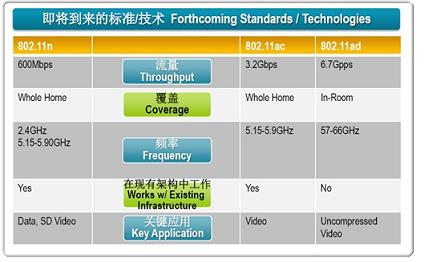 在802.11a/b/g/n等標(biāo)準(zhǔn)不斷刷新更高覆蓋率和數(shù)據(jù)傳輸率的同時(shí),新的標(biāo)準(zhǔn)如802.11ac、802.11ad等都正在嶄露頭角。Michael介紹說,與802.11n 600Mbps的流量相比,ac和ad的流量將分別高達(dá)3.2Gbps和6.7Gbps,頻率范圍分別為5.15GHz~5.9GHz和57GHz~66GHz。從應(yīng)用角度看,ac會定位在整個(gè)家居多個(gè)室內(nèi)的多媒體內(nèi)容共享;而ad由于傳輸距離有限,用于單個(gè)居室內(nèi)未壓縮高清視頻的短距離傳輸,即可能會成為HDMI標(biāo)準(zhǔn)的替代者。