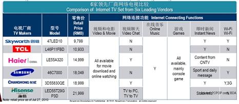 “相比國外廠商認(rèn)為規(guī)則尚不明確,持保守態(tài)度,國內(nèi)的電視機(jī)廠商比國外同行顯得更熱衷網(wǎng)絡(luò)電視!盡ichael表示,“長虹、TCL、海信、康佳及創(chuàng)維等廠商都在2009年推出了各自的網(wǎng)絡(luò)電視系列,網(wǎng)絡(luò)電視被國內(nèi)電視廠商視為開拓藍(lán)海市場,獲取更多利用的機(jī)會。尤其在三網(wǎng)融合的背景下,網(wǎng)絡(luò)電視在中國被普遍認(rèn)為將有很大前景!