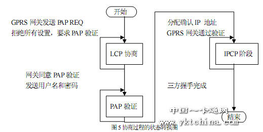 系統(tǒng)的一個(gè)難點(diǎn)是微控制器登陸 GPRS 網(wǎng)關(guān)(GGSN)并與網(wǎng)關(guān)通過LCP、PAP、IPCP 協(xié)議進(jìn)行協(xié)商的過程。LCP、PAP 與IPCP 協(xié)議的幀結(jié)構(gòu)大同小異,最常用的為請(qǐng)求(REQ)、同意(ACK)和拒絕(NAK)三種幀。微控制器與GGSN 各為一方進(jìn)行協(xié)商,任何一方都可以發(fā)送REQ 幀請(qǐng)求某方面的配制,另一方覺得配置不能接受會(huì)回應(yīng)NAK 幀,如果可以則回應(yīng)ACK 幀。為了節(jié)省資源,我們只處理這三種數(shù)據(jù)幀,其它鏈路問題都由微控制器在程序控制下自己重新?lián)芴?hào)解決。協(xié)商過程大致描述如下:在撥號(hào)成功連接后,GGSN 首先會(huì)返回一個(gè)PAP REQ 數(shù)據(jù)幀。我們發(fā)送一個(gè)空 LCP REQ 幀,以強(qiáng)迫進(jìn)行協(xié)議協(xié)商階段。隨后,GGSN 發(fā)送LCP 設(shè)置幀,我們拒絕所有的設(shè)置并請(qǐng)求驗(yàn)證模式。GGSN 選擇CHAP 或PAP 方式驗(yàn)證,我們只接受PAP 方式。然后,進(jìn)行PAP 驗(yàn)證用戶名和密碼過程,在GPRS 中用戶名與密碼都為空,如果成功,GGSN 會(huì)返回IPCP報(bào)文分配動(dòng)態(tài)IP 地址。此時(shí),就完成了與GGSN 的協(xié)商過程。協(xié)商過程的狀態(tài)轉(zhuǎn)換如圖5 所示。