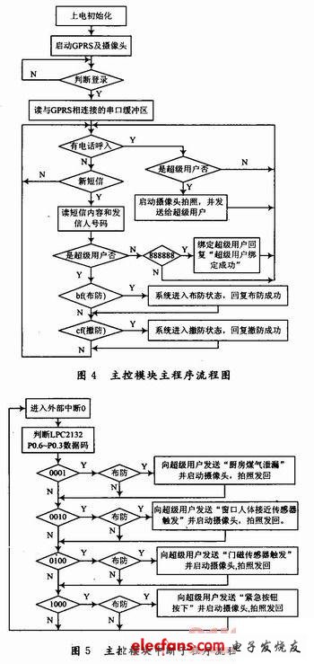 在主控模塊主程序中系統(tǒng)一直在檢測是否有來電和新短信信息,當(dāng)有來電時(shí)系統(tǒng)會自動掛斷電話,然后判斷是不是超級用戶:是,啟動攝像頭拍照,并發(fā)送給超級用戶;不是,系統(tǒng)將不理睬,繼續(xù)檢測。當(dāng)是短消息時(shí),判斷是否是超級用戶:不是,判斷短信內(nèi)容是“888888 ”否,是則系統(tǒng)綁定該號碼為超級用戶,并回復(fù)“超級用戶綁定成功”;是,判斷短信內(nèi)容是否是“bf”或“cf”,是“bf”系統(tǒng)進(jìn)入布防狀態(tài),并回復(fù)“布防成功”,是“cf”系統(tǒng)撤防,回復(fù)“撤防成功”。