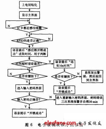 如圖2所示,電子鎖原始密碼和用戶設(shè)定密碼已存于外部存儲器E2PROM內(nèi),用戶要開門需先用電子感應(yīng)鑰匙開RFID碼感應(yīng)鎖,當(dāng)感應(yīng)鎖成功開鎖時(shí),系統(tǒng)將發(fā)出語音提示“感應(yīng)鎖開鎖成功”,然后輸入先前設(shè)定的密碼,密碼正確后,系統(tǒng)發(fā)出語音提示“開鎖成功”,否則提示“輸入密碼錯誤”。輸入密碼三次以上錯誤,系統(tǒng)將報(bào)警并自鎖30 min。整個(gè)開鎖時(shí)間不能超過30 s,否則系統(tǒng)發(fā)出警報(bào)聲,以防止盜賊在短時(shí)間內(nèi)利用萬能工具開鎖。系統(tǒng)待機(jī)時(shí)能在液晶上顯示時(shí)間、日期和星期等信息,實(shí)現(xiàn)友好的人機(jī)界面。
