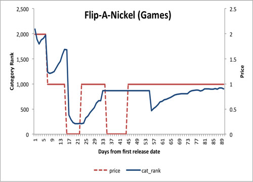 觀察那些熱門付費(fèi)應(yīng)用的運(yùn)營策略,你會(huì)發(fā)現(xiàn)一個(gè)通行的做法——降價(jià)。降價(jià)的好處是使應(yīng)用的排名的快速上升。熱門付費(fèi)應(yīng)用在它們整個(gè)生命周期內(nèi)至少會(huì)降價(jià)一次。以上圖ASD公司開發(fā)的娛樂應(yīng)用FlipANickel為例,應(yīng)用發(fā)布時(shí)的價(jià)格為1.99美元。七天后,應(yīng)用降價(jià)至0.99美元的同時(shí)排名從2200飆升至229。