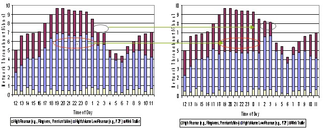 合理調(diào)配資源是指應(yīng)用智能管道技術(shù),并結(jié)合激勵型市場定價,運(yùn)營商能夠減少網(wǎng)絡(luò)空載時間或降低低載率,在網(wǎng)絡(luò)忙時留出更多的資源給高付費(fèi)用戶和業(yè)務(wù),從而在相同的資源下獲得更高的收益。下圖是某運(yùn)營商引入智能管道前后的數(shù)據(jù)分布效果圖,忙時高付費(fèi)業(yè)務(wù)增加,非忙時總業(yè)務(wù)量增加(主要來自于低付費(fèi)業(yè)務(wù)),這些都為運(yùn)營商帶來了額外的收入。實(shí)際增收效果會因智能管道策略的力度和動態(tài)調(diào)整的效果而有不同,通常都會增加幾個百分點(diǎn)甚至更高。