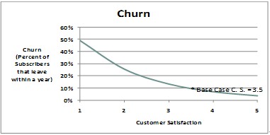 部署智能管道可以在網(wǎng)絡(luò)容量和業(yè)務(wù)保障方面產(chǎn)生積極影響。針對高端用戶提供免溢價的高價值服務(wù)/業(yè)務(wù),會提高高端用戶群體的滿意度。高端用戶是高額利潤的保障,是所有運(yùn)營商爭取的目標(biāo),而用戶滿意度是決定他們是否留在網(wǎng)絡(luò)的最重要因素。應(yīng)用智能管道后,預(yù)期年離網(wǎng)率將下降1%~2%。離網(wǎng)率的降低,將使用戶平均停留在本網(wǎng)絡(luò)的周期加長,從而增加收入并減少新用戶的獲取成本。這一部分的價值和意義,將大于資源合理分配和差異化業(yè)務(wù)的價值。下面的圖表顯示了離網(wǎng)率和用戶滿意度的關(guān)系。