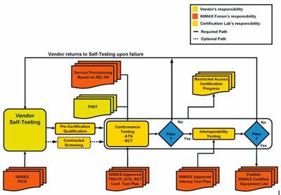 WiMAX認(rèn)證程序2004年10月被批準(zhǔn),到2005年中期開(kāi)始正式實(shí)行。整個(gè)認(rèn)證流程對(duì)物理層和媒體接入層(MAC)進(jìn)行兩種類(lèi)型的測(cè)試,即性能測(cè)試和互通性測(cè)試。前者是為了確保設(shè)備可以正確實(shí)現(xiàn)由IEEE802.16以及ETSIHiperMAN標(biāo)準(zhǔn)給定的技術(shù)規(guī)范,而后者是檢驗(yàn)不同廠家的產(chǎn)品在同一網(wǎng)絡(luò)中的協(xié)同工作情況,互通性測(cè)試要求至少三家以上不同公司的設(shè)備參與,它們具有相同的系統(tǒng)配置文件(頻譜波段、信道寬度以及雙工方式)。