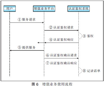 用戶在使用增值業(yè)務(wù)時,增值業(yè)務(wù)系統(tǒng)通過接口向認(rèn)證鑒權(quán)系統(tǒng)發(fā)起實時用戶鑒權(quán)請求,認(rèn)證鑒權(quán)系統(tǒng)按照用戶付費類型對用戶進行鑒權(quán),并對預(yù)付費用戶進行實時計費處理,成功后向增值系統(tǒng)反饋信息;對后付費用戶,產(chǎn)生原始使用記錄。