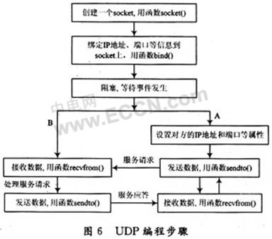 在本系統(tǒng)中,在一個(gè)網(wǎng)段內(nèi)的任意兩個(gè)應(yīng)用程序之間可以進(jìn)行全雙工通信,每個(gè)應(yīng)用程序既可做為服務(wù)器又可做為客戶端。其UDP編程步驟如圖6所示,以下是兩個(gè)應(yīng)用程序A和B之間進(jìn)行點(diǎn)對(duì)點(diǎn)通訊的具體實(shí)現(xiàn)過程: