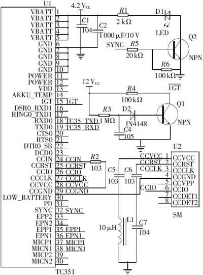 。由于該模塊電源引腳有5個,且電壓都是3.3~4.8V,因此本設(shè)計將5個引腳連在一起,直接接到外部4.2V電源上。但是本系統(tǒng)的外部電源是12V的直流電流,所以設(shè)計時采用LM2941穩(wěn)壓為4.2V.GPRS模塊上的引腳IGT主要是用于點火復(fù)位,其作用是作為GPRS模塊的一個復(fù)位轉(zhuǎn)換系統(tǒng),加電后為使TC35I進入工作狀態(tài),必須給IGT加一個大于100ms的低脈沖,電平下降持續(xù)時間不可超過1ms,這里通過RC電路來實現(xiàn)。TC35I的第32腳SYNC引腳有兩種工作模式,一種是指示發(fā)射狀態(tài)時的功率增長情況,另一種是指示TC35I的工作狀態(tài),可用AT命令A(yù)T+SYNC進行切換,本模塊使用的是后一種。GPRS模塊和單片機之間的數(shù)據(jù)通信主要是通過端口TXD0與TXD之間、RXD0與RXD之間的數(shù)據(jù)傳輸來完成。其中,GPRS模塊上的TXD0口用于接收從單片機傳來的數(shù)據(jù),而單片機上的TXD端口用于向GPRS模塊傳送數(shù)據(jù)。GPRS模塊上的RXD0口用于向單片機發(fā)送數(shù)據(jù),單片機的RXD口則用于接收從GPRS模塊傳輸來的數(shù)據(jù)。在TC35I的基帶處理器上有一個綜合SIM接口,該接口直接接線到主機接口(端到端連接器),用于連接到外部的SIM卡座。本系統(tǒng)接的SIM卡有CCCLK、CCVCC、CCIO、CCRST、CCIN、CCGND
