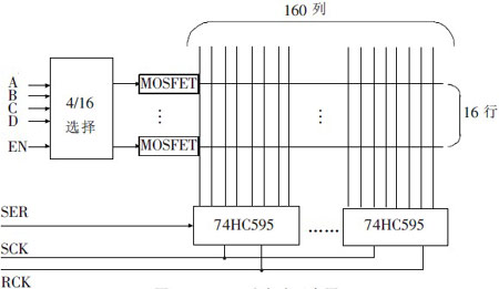 本系統(tǒng)采用行掃描方式,行選通電路由集成電路74HC154構(gòu)成。74HC154是4線-16線高性能譯碼器,在點陣屏幕不大的情況下,一般的單片機可以直接驅(qū)動點陣LED的亮滅,但是考慮擴展為大屏幕尺寸時,因單片機的I/O口不足以提供足夠的驅(qū)動電流,但可在74HC154和點陣的行接口接上一個PNP型8550三極管開關(guān)電路用來提供足夠的電流,當(dāng)74HC154發(fā)出低電平時,三極管Q導(dǎo)通,輸出高電平。此外,可用帶有2級鎖存移位輸出功能的74HC595鎖存器來對列線進行驅(qū)動控制。LED點陣的列線接到74HC595的8bit并行輸出口上,由單片機控制數(shù)據(jù)的輸出,利用74HC595的鎖存輸出功能,電路共用同一個移位時鐘SCK和數(shù)據(jù)鎖存時鐘RCK,可級聯(lián)多片74HC595以構(gòu)成更大LED點陣屏的列驅(qū)動電路。此結(jié)構(gòu)還可在75HC595的使能端通過PWM波進行灰度調(diào)節(jié)。以一個16行×160列的LED點陣單元為例,本系統(tǒng)采用的驅(qū)動電路原理如圖所示。