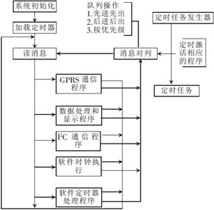 該下位機軟件設(shè)計包括主程序、顯示子程序和通信服務(wù)程序的設(shè)計。主程序主要完成中斷的初始化和串口的初始化設(shè)置。顯示程序主要完成數(shù)據(jù)的各種顯示,顯示部分采用動態(tài)掃描的方式,實現(xiàn)對顯示屏要顯示的漢字、圖像、字符等數(shù)據(jù)信息進行傳輸控制以及顯示等功能。通信服務(wù)程序主要完成GPRS的數(shù)據(jù)接收、數(shù)據(jù)的分割處理、數(shù)據(jù)的發(fā)送等任務(wù)。本文采用模塊化程序設(shè)計,程序各部分的功能由各個模塊分別實現(xiàn)。程序模塊有:系統(tǒng)初始化模塊、GPRS通信模塊、數(shù)據(jù)的處理和存儲模塊、I2C通信模塊。為了保證系統(tǒng)工作的實時性和高效性,本系統(tǒng)采用了實用單片機系統(tǒng)MS3,MS3是一套針對MCU51的開發(fā)平臺,借簽了VC編程的消息機制,把各個功能有效地組織起來。RTOS的系統(tǒng)時鐘,實現(xiàn)高效的按鍵掃描和快速的響應(yīng)中斷,執(zhí)行例行程序。顯示終端主程序如圖所示。
