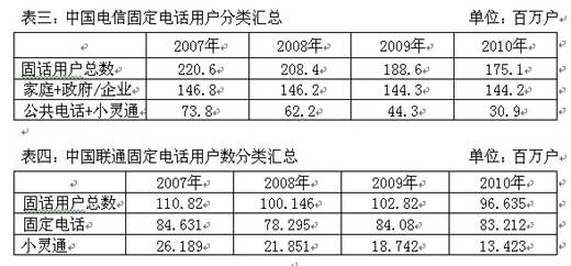 從表中可以看出,中國電信每年的固定電話用戶總數持續(xù)下降,下降速度最快的是小靈通業(yè)務,剔除小靈通和公共電話業(yè)務,中國電信的固定電話用戶量實際上一直穩(wěn)定在1.4億戶以上,中國聯通公司的固定電話用戶量則一直穩(wěn)定在8000萬戶以上。