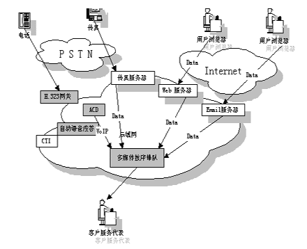 多媒體呼叫中心實際上是基于CTI 技術的傳統(tǒng)呼叫中心與 ICC 的相互結合。現(xiàn)在許多呼叫中心把各種媒體通信技術集成到了一起,允許座席員同時可以處理語音呼叫﹑Web請求﹑e-mail和傳真。其簡單示意圖如下: