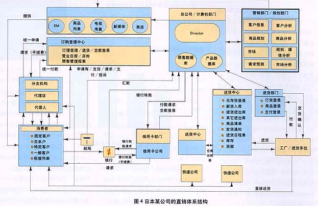 ——圖4示意了日本某家大型通信公司的體系結構。一般來說,直銷體系由以下幾大環(huán)節(jié)構成: