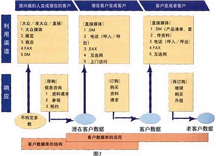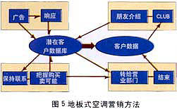 ——銷售支持:東京煤氣公司擁有三種主要的家用產(chǎn)品:地板式空調,煤氣暖氣及煤氣衣服干燥機。此公司于1993年開始運用數(shù)據(jù)庫營銷,現(xiàn)已取得了驕人的成果。其中主力產(chǎn)品——地板式空調,盡管周期長、價格高,1997年一年就銷售了3萬6千套,同時從對這些用戶調查的結果發(fā)現(xiàn)“滿意”的占96%。下面介紹一下“地板式空調”的營銷方法(見圖5)